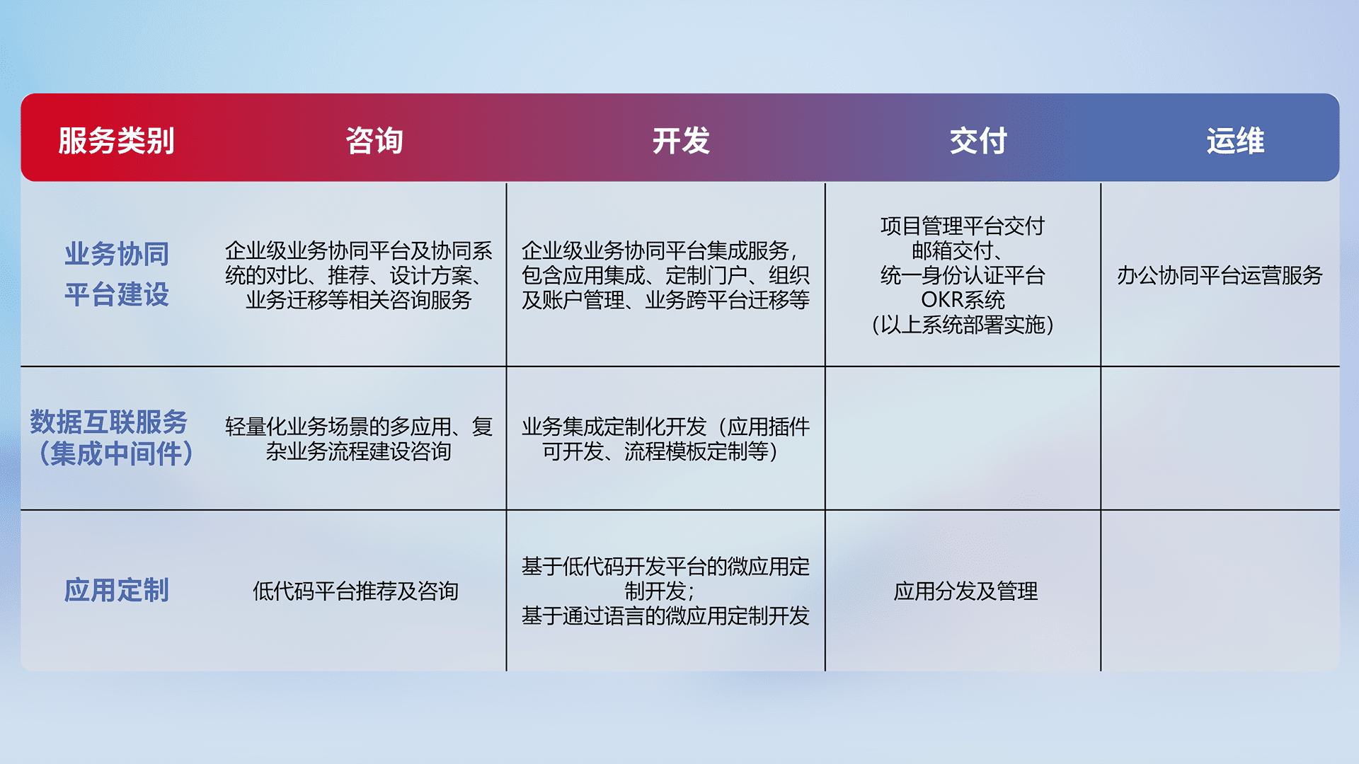针对钉钉、、、企微、、IDaas等平台级产品提供产品的规划、、、、方案、、交付、、、、定制化开发等服务,,,实现如统一协同办公、、、智能客户服务、、、混合会议管理、、、、智能数据查询、、、等业务场景,,,,实现数字化转型。。。